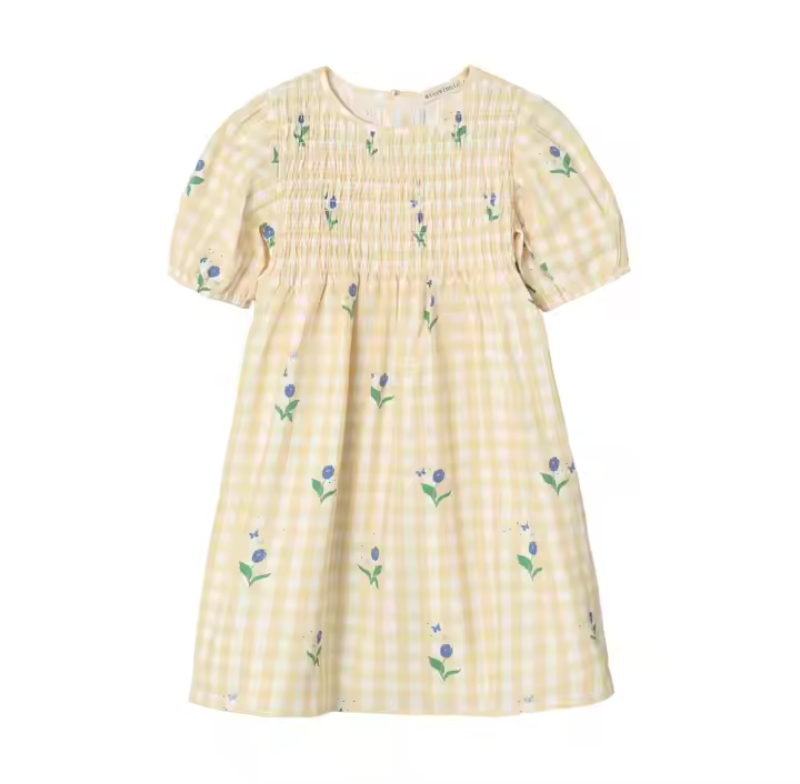Casual Style Short Sleeve Seersucker Cotton with Floral Print Smocking Dress for Kids Girls Summer Dress