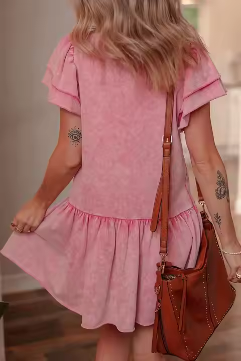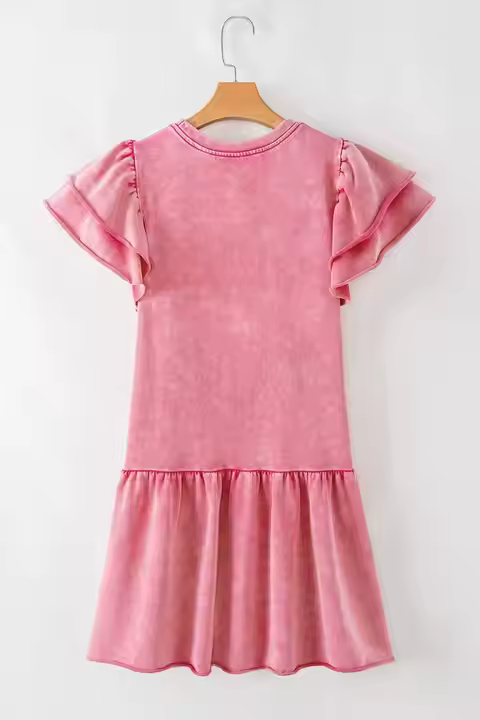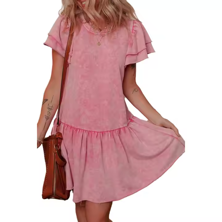 Custom Vintage Pink Cotton Girls Dress for Teenage Girls 12-20 Years O-Neck Raw Edge Ruffle Mineral Acid Denim Stone Wash ODM