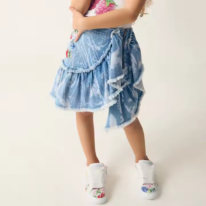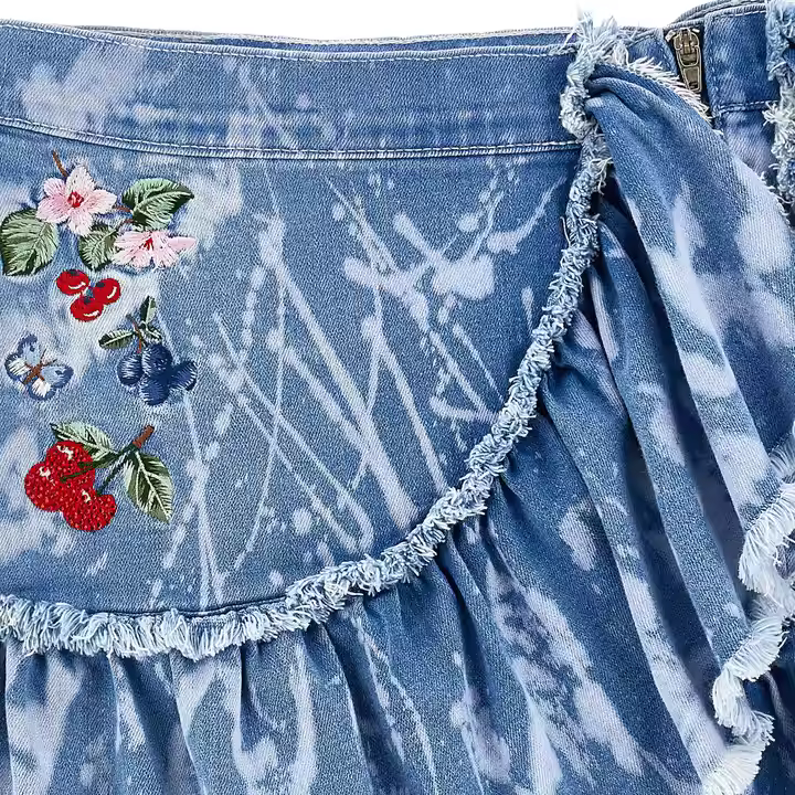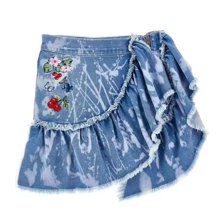 Custom 100% Cotton Girls Denim Skirt Asymmetrical Floral Embroidered Special Wash with Frayed Edges Short Style
