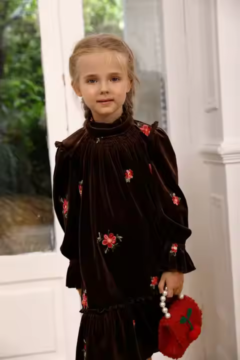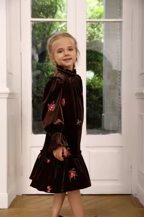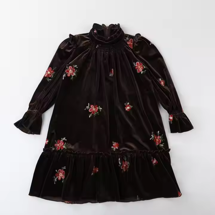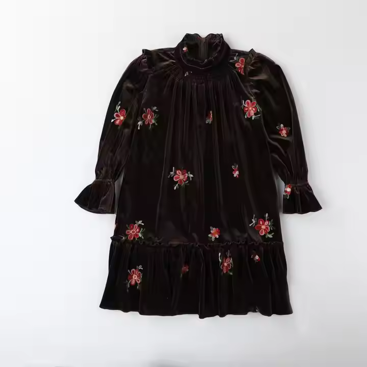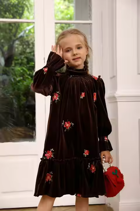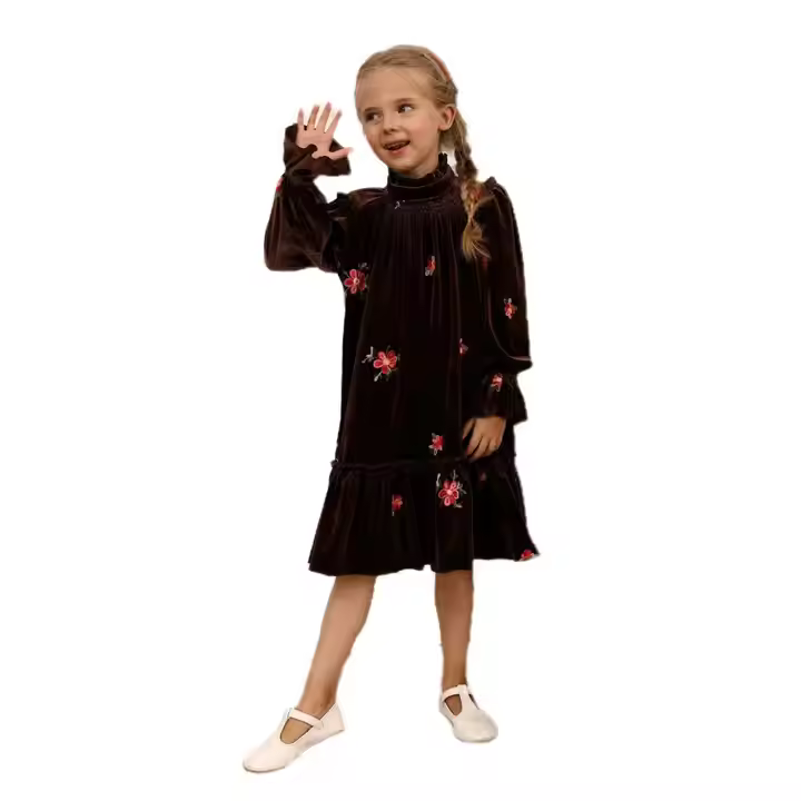 Customized Guangzhou Factory Girls Dress Vintage Embroidered Velvet Spring Smocked Dress Long Sleeve OEM/ODM