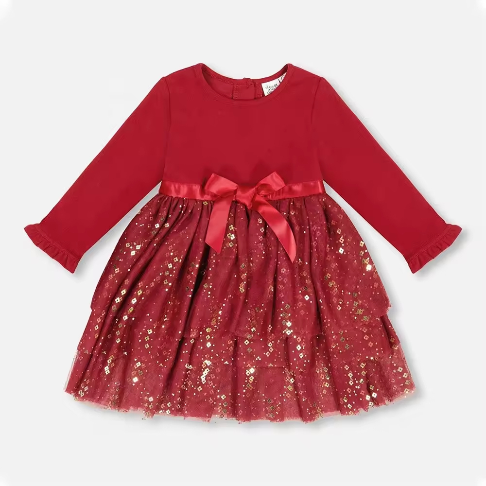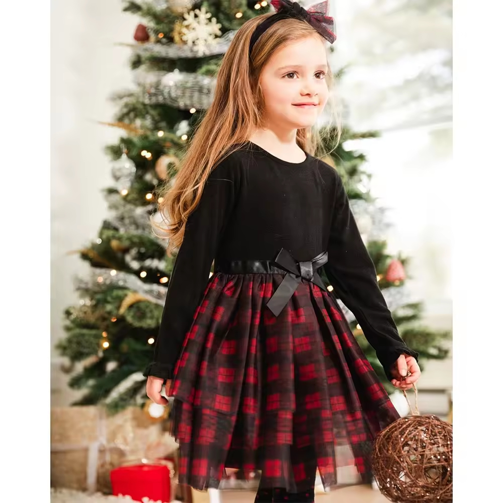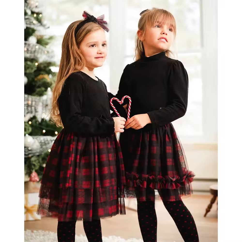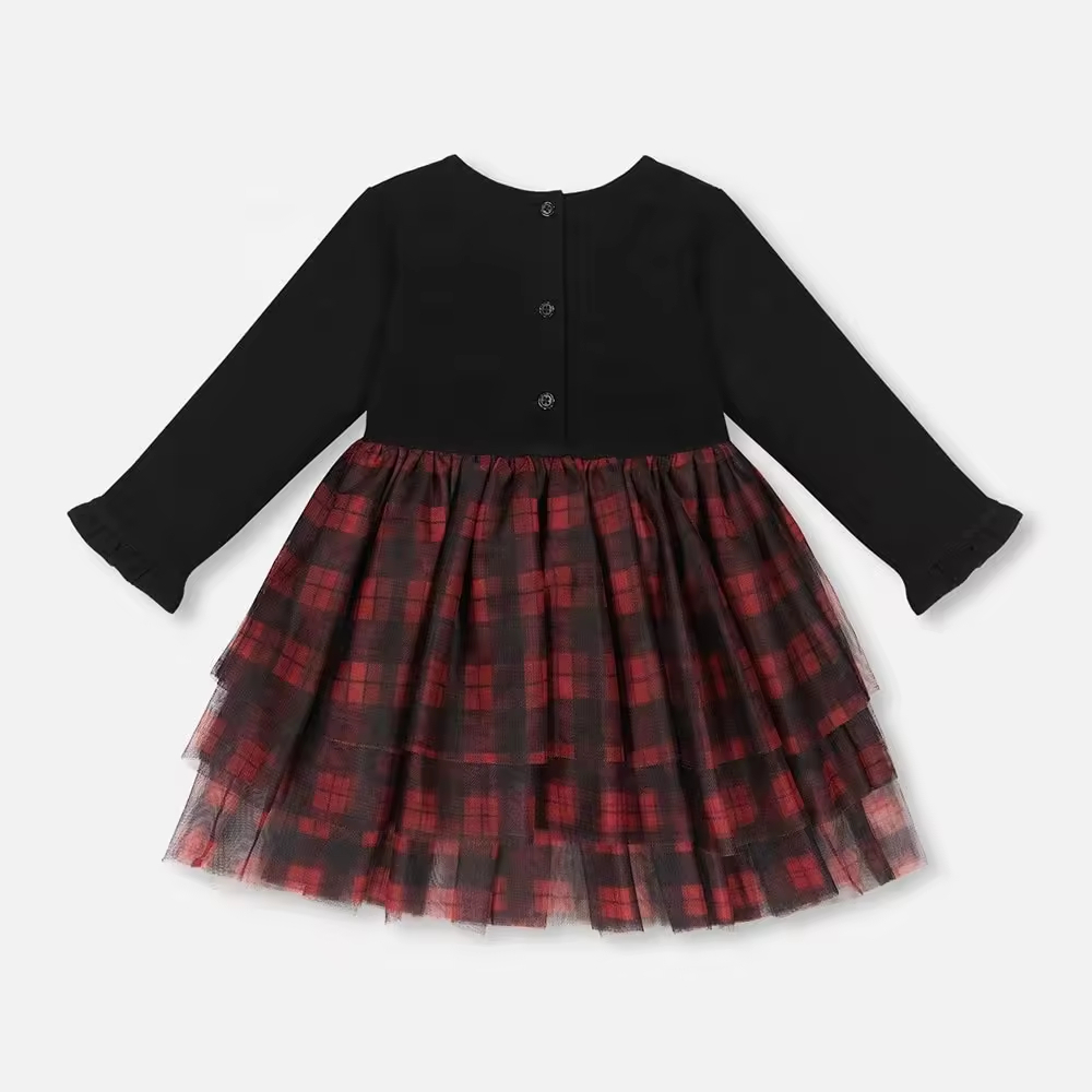 High Quality Custom Black and Red Plaid Girls Dress with Long Sleeves and Lace Layer O-Neck Collar Direct Factory Supply