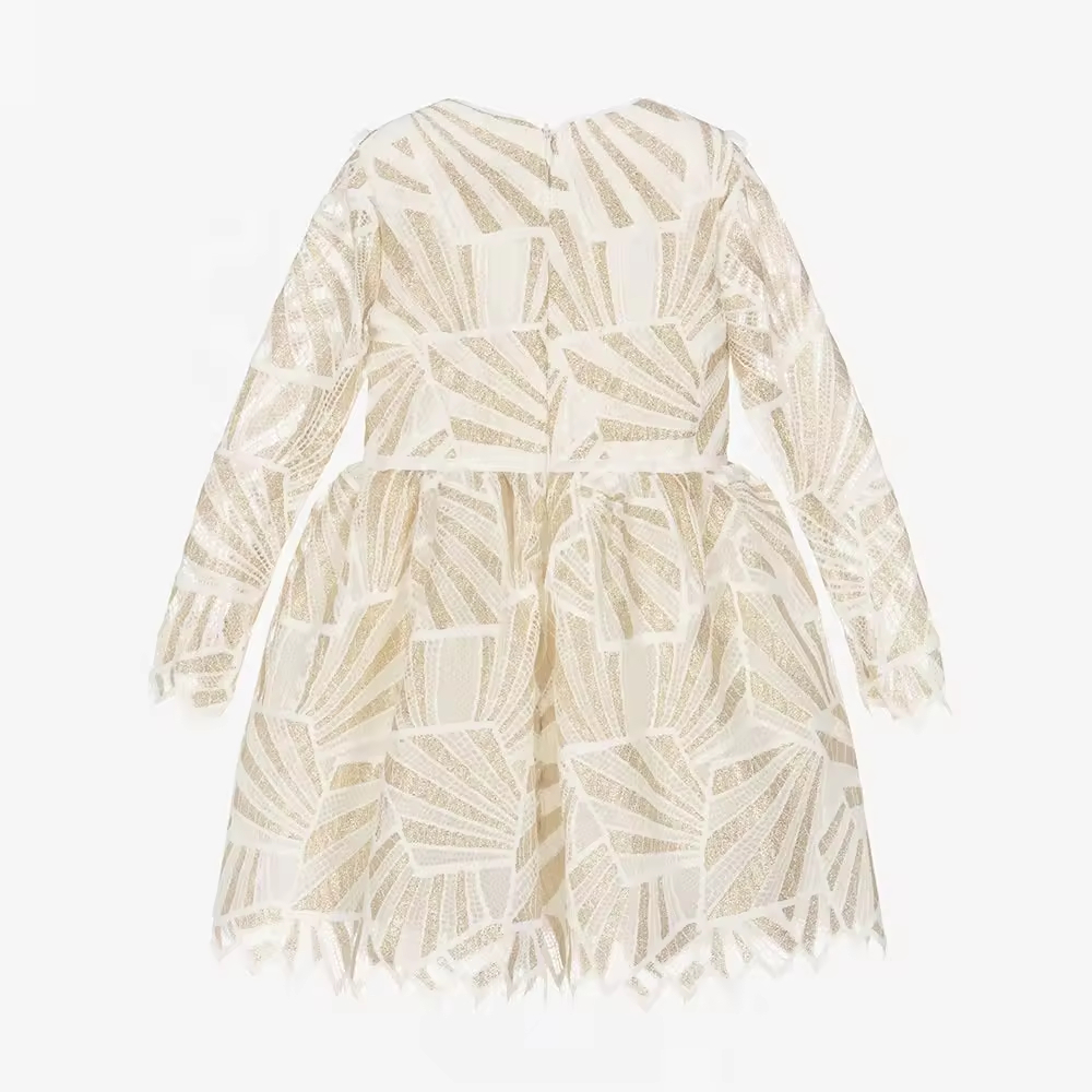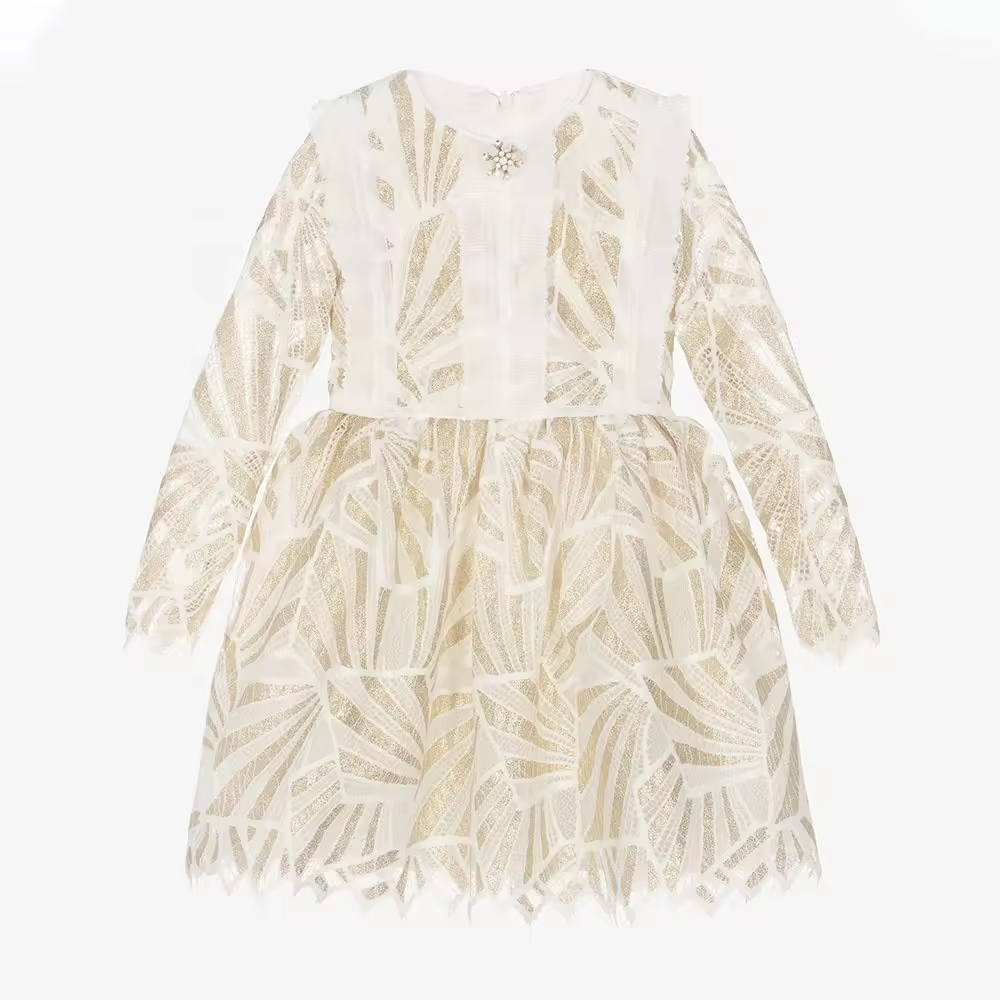 Custom High Quality Fancy Lace Gold Color Children Girls Dresses for Party Wedding Birthday Western Style Kids Clothing