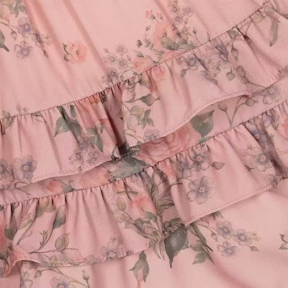 /Custom Chiffon Children Girl Dress pink Flower Printed Kids Dresses Wholesale High Quality 6-14 Kids Clothing Factory