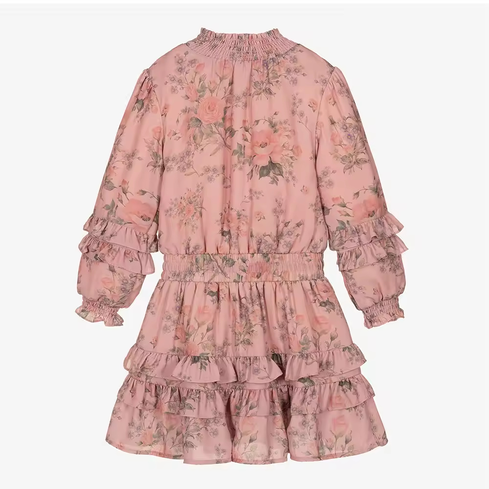 Custom Chiffon Children Girl Dress pink Flower Printed Kids Dresses Wholesale High Quality 6-14 Kids Clothing Factory