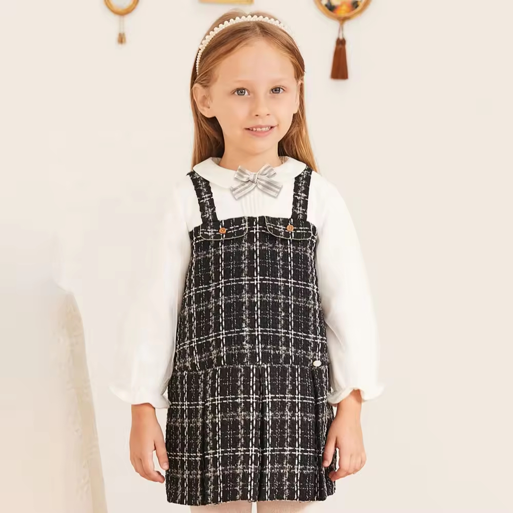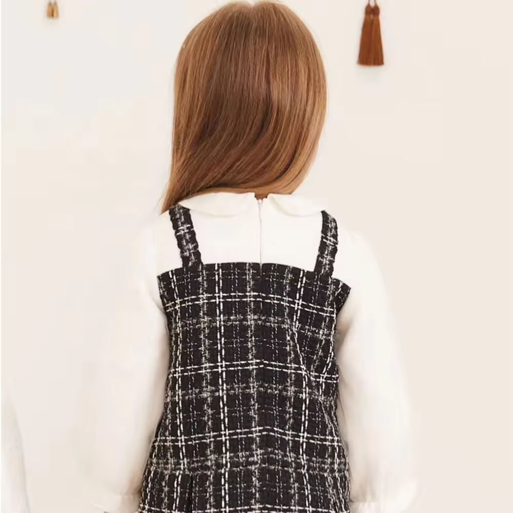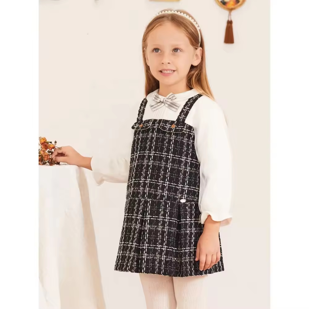 High Quality Kids Clothes Custom Black White Checked Winter Dress for Girls O-Neck Collar Crocheted Technics Direct Factory