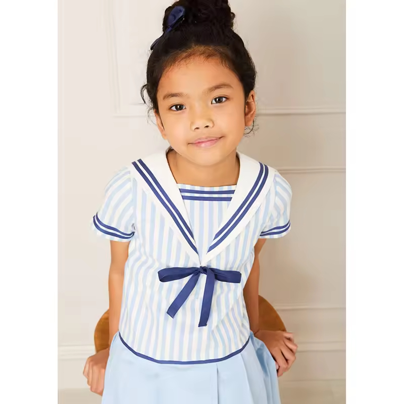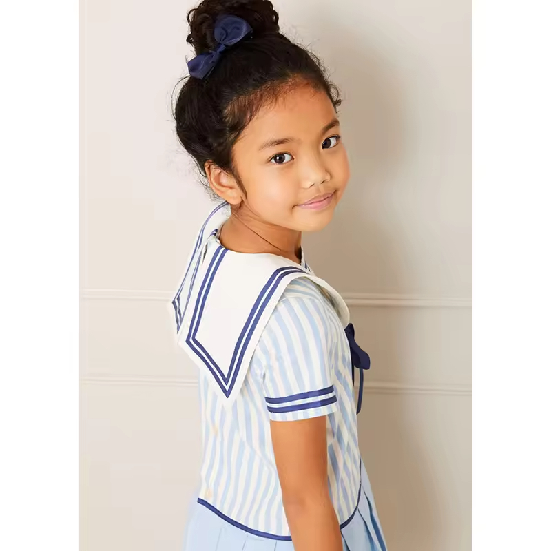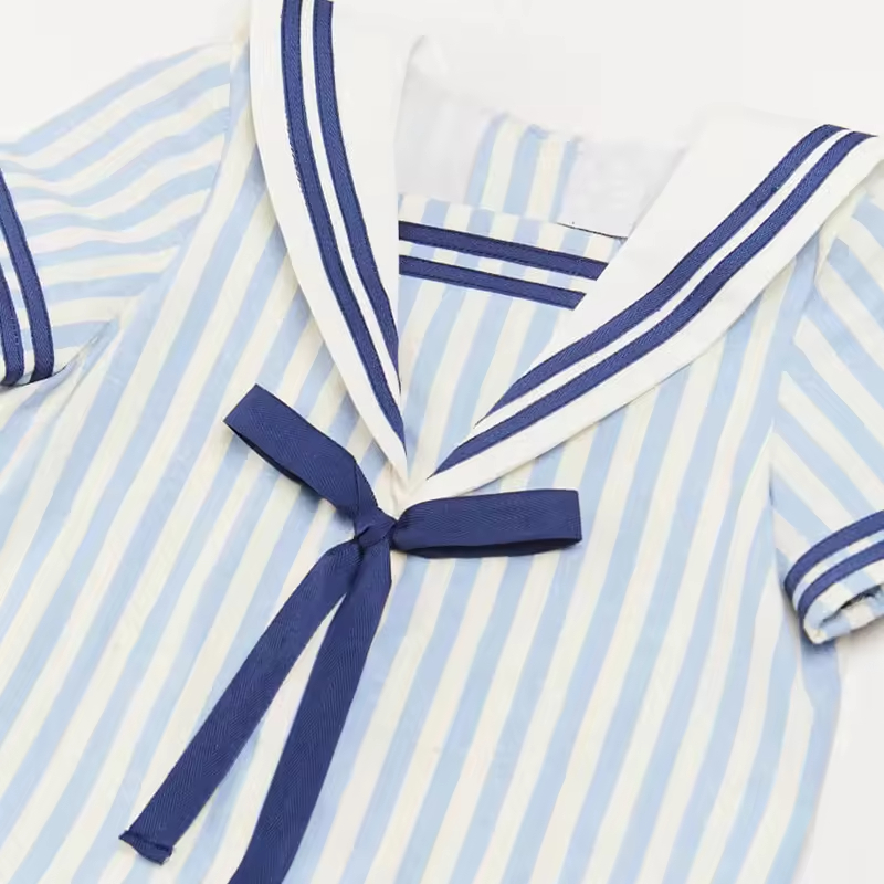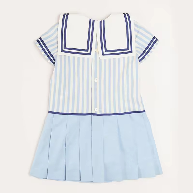 /Popular Girl's Dress Short Sleeve Sailor Collar White Blue Stripe Dress for Baby Summer 2024