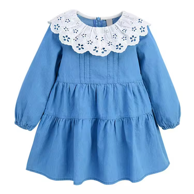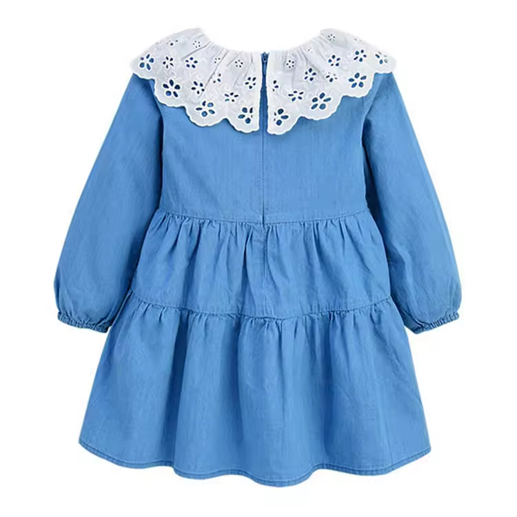 Guangzhou Manufacturer Fashion Newest Design Long Sleeve Girls' Dresses Lacework Collar Knee Length Denim Dress