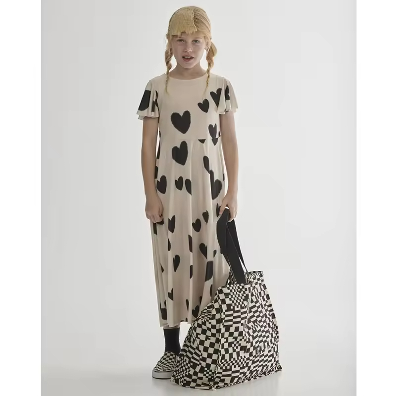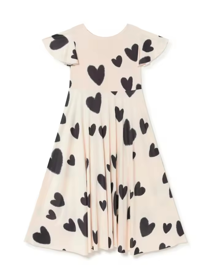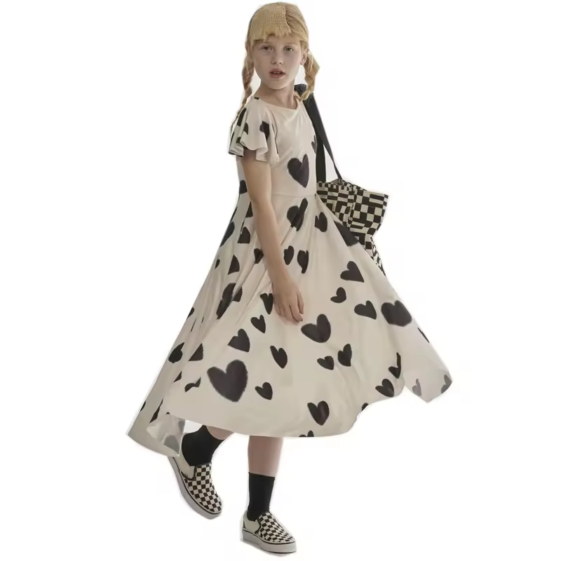 Heart Printed Girl's Long Dress Flared Short Sleeves Girls Twirl Dress