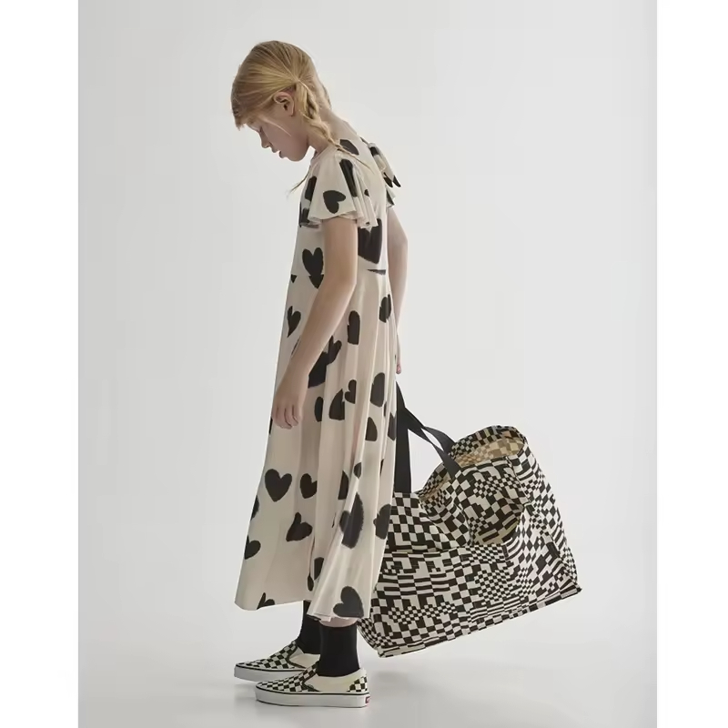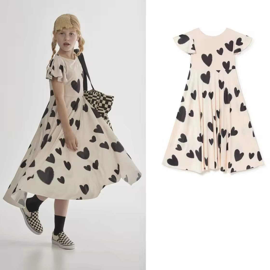 /Heart Printed Girl's Long Dress Flared Short Sleeves Girls Twirl Dress