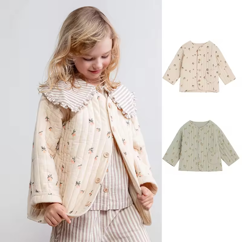/2024 Newest Design Floral Printed Baby Jackets & Outwears Toddler Girl 100% Cotton Collarless Thin Padded Coat