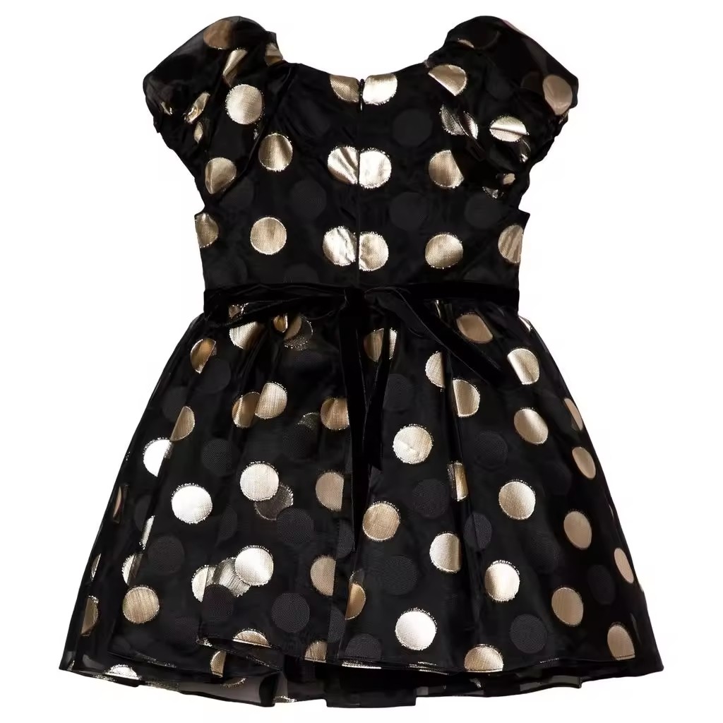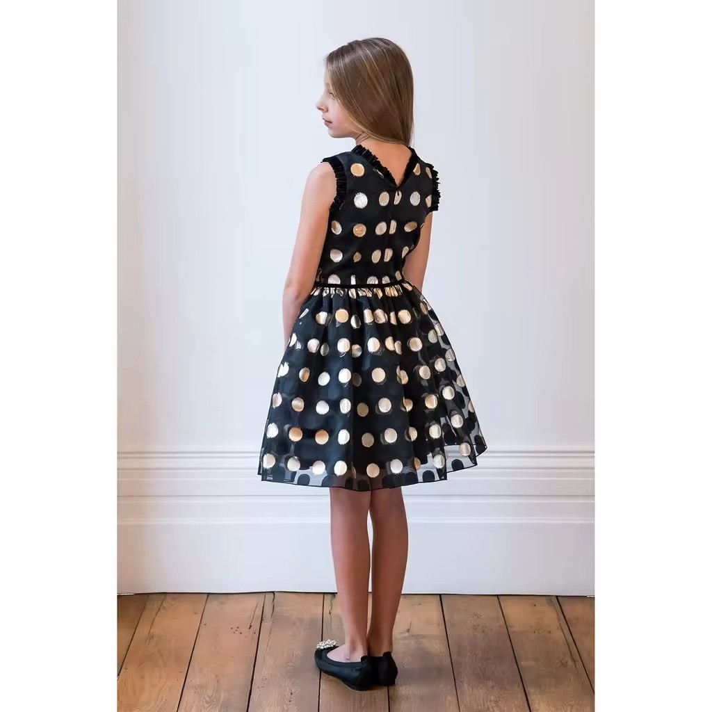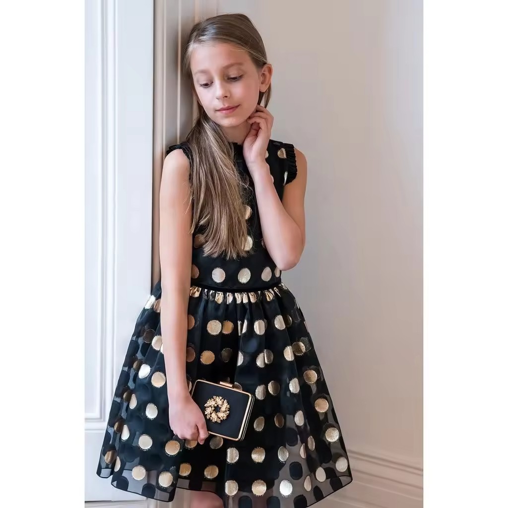 Custom 2024 Elegant Black Lace Children Girls Dresses With Gold Dot Boutique Baby Girl Dress for Party Ball Grown Kids Clothing