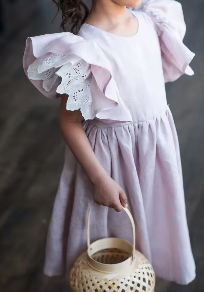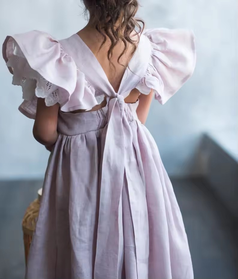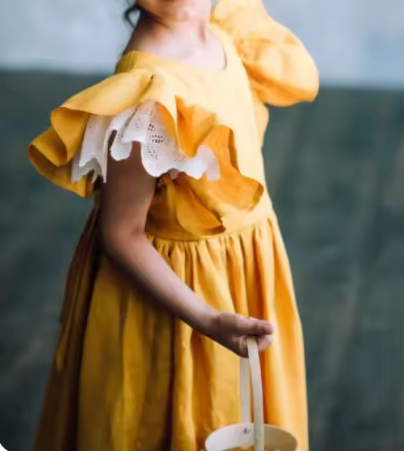 /Mustard Linen Dress for Girl With Flutter Sleeve, Girls Linen Pinafore Dress, Toddler Cotton Linen Dresses