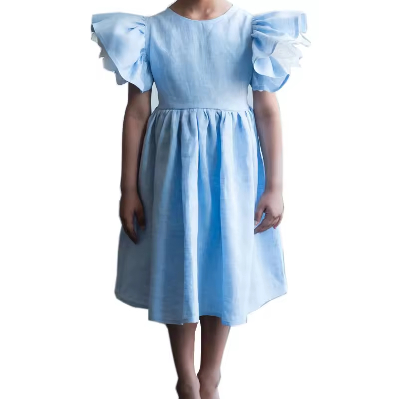 Custom Summer Light Blue Puffy Sleeve Kids Clothes Baby Cotton Jean Denim Basic Vintage Look Dress Girls Dresses for Girls