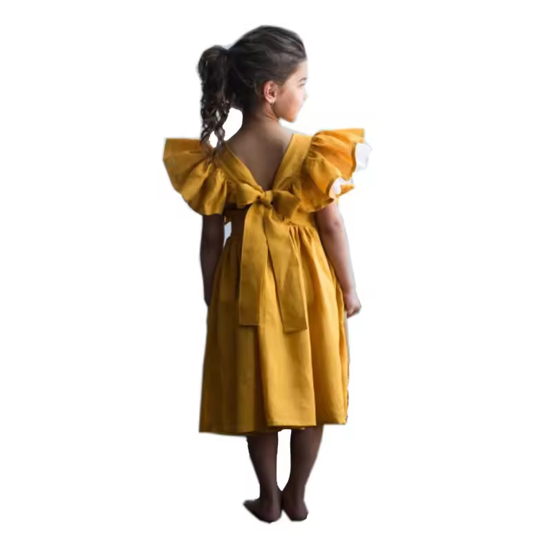 Mustard Linen Dress for Girl With Flutter Sleeve, Girls Linen Pinafore Dress, Toddler Cotton Linen Dresses
