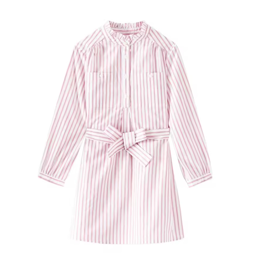 Customization Summer Style Cotton Shirt Dress for Kids Girls with O-Neck and Striped Pattern Long Sleeves and Belt