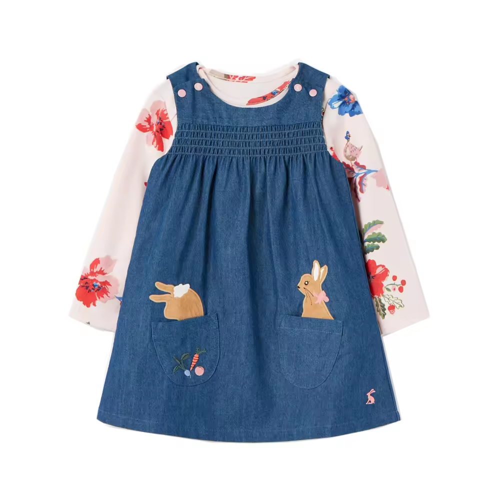Denim Tank Dress Fake 2 pcs Long sleeves Dress Smocking With Embroidery For Kids Girls 6-10 y Manufacturing