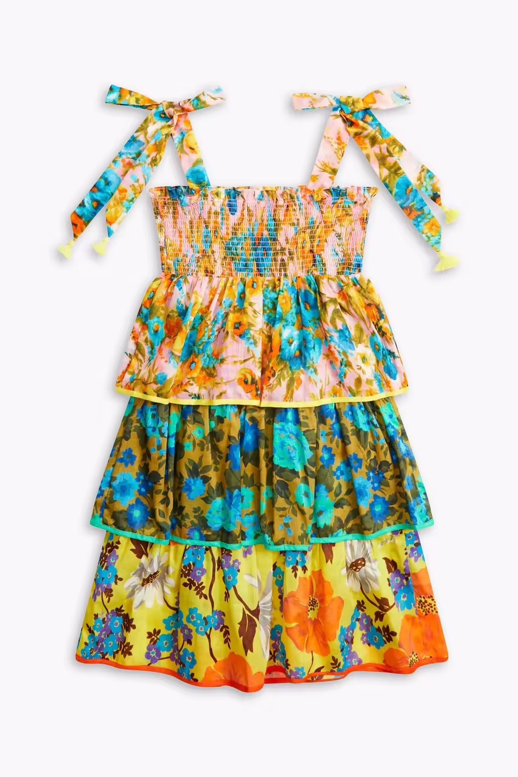 Boutique Tiered Floral Print Cotton Dress for Girls Halter Design Pinafore Nets Layer Dress with Age Appropriate Decoration
