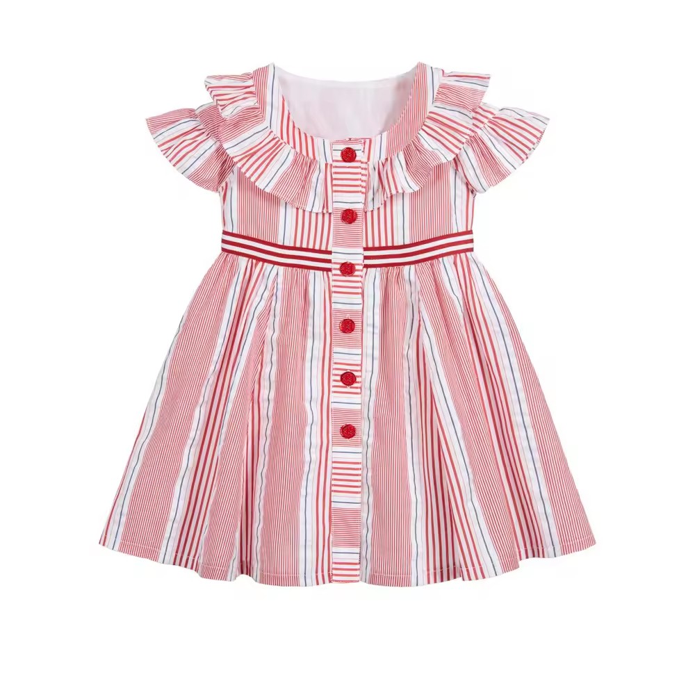 Customized Newest Design Buttons Front Ruffles Collar Dresses Kids Woven Cotton Yarn Dyed pink White Stripes Girl Dress