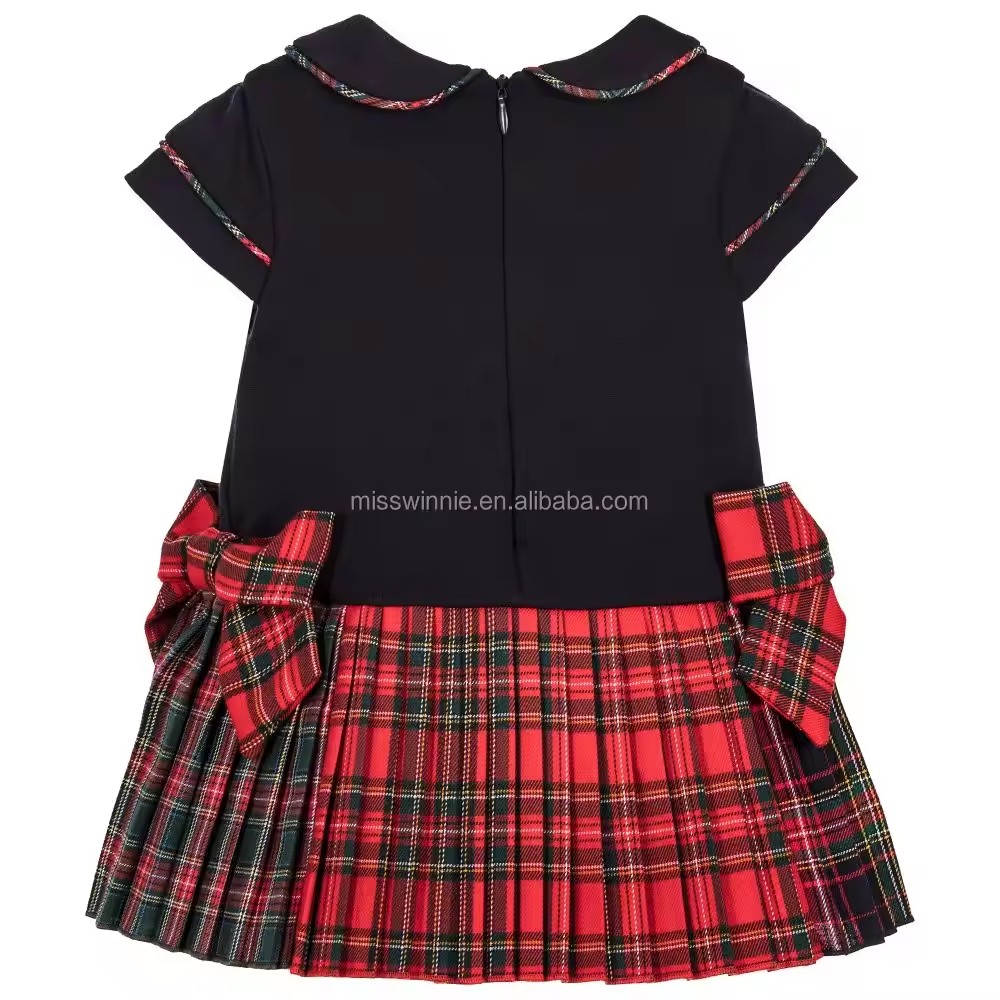 /Girls' Tartan Pleat Dress with Peter Pan Collar Bow Decoration Cotton Casual Short Sleeve Style for Summer for Children